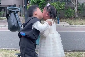 俩孩子一起玩耍时女孩突然崩溃大哭,男孩立马上前亲亲安慰