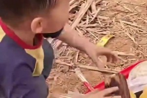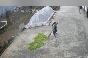 孩子独自在家时发现下雨,自己在院子里将草糠全部收回来