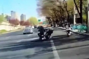 大爷走在机动车道突然右拐,导致刚蹭到旁边两辆电动车