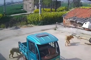 狗子在三轮车上绑着,结果三轮车溜车带着狗掉进沟里