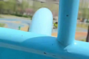 女孩滑滑梯时姥爷在下面等着,女孩已经滑下去趴在地上姥爷还在等